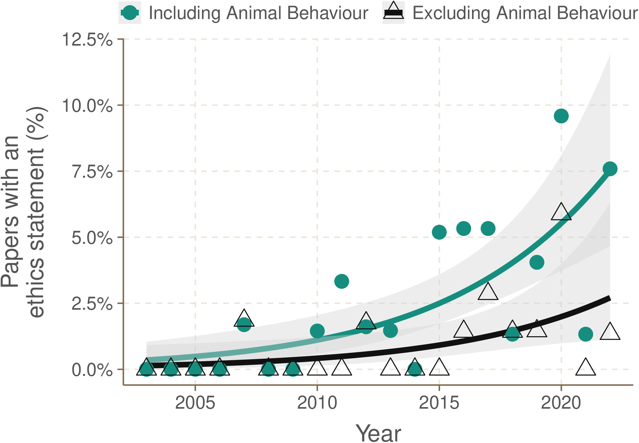 The increased trend of reporting on the ethical treatment of insects in Animal Behaviour is likely driven by editorial policy, which has included insects in the scope of welfare concern for the journal since 2004. The slow increase in ethics statements outside the journal in the rest of our sample indicates there may be some extremely gradual cultural shift in the field but that editorial policies play a larger role in shaping current reporting practices.