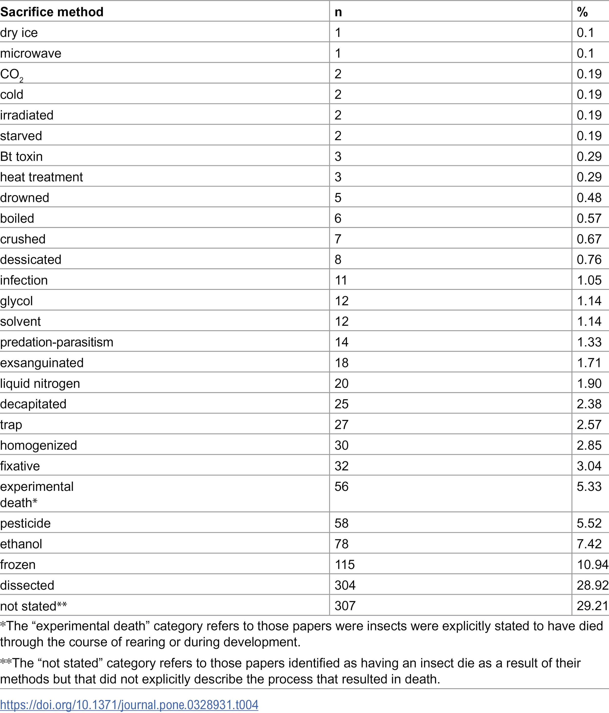 Sacrifice methods used with insects in the 1359 papers surveyed.